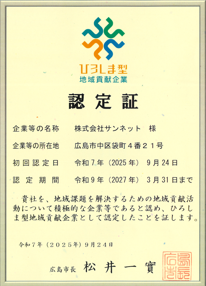 当社の地域貢献活動が広島市に認められ「ひろしま型地域貢献企業」として認定されました。