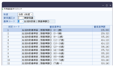 審査基準をマスタ管理することで、生活保護基準に準じた認定判定ができます。