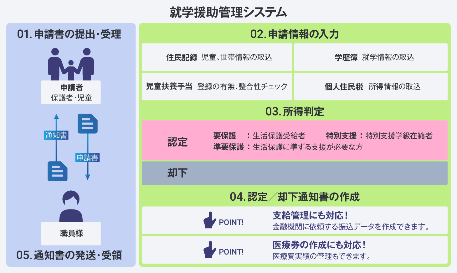 児童生徒の就学援助費(就学奨励費)の認定請求を受け付け、就学援助(要保護、準要保護、特別支援)の申請~認定~喪失を管理し、各費目の支給を管理します。